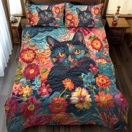 Playful Floral Cats 3-Piece Quilted Bedding Set NCU0PD324