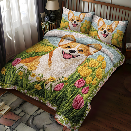 Tulip Bliss with Corgi 3-Piece Quilted Bedding Set NCU0DK1605