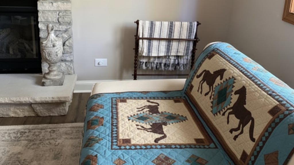 This horse-patterned quilted cover adds rustic charm to my living room. It feels cozy and looks beautiful by the fireplace!